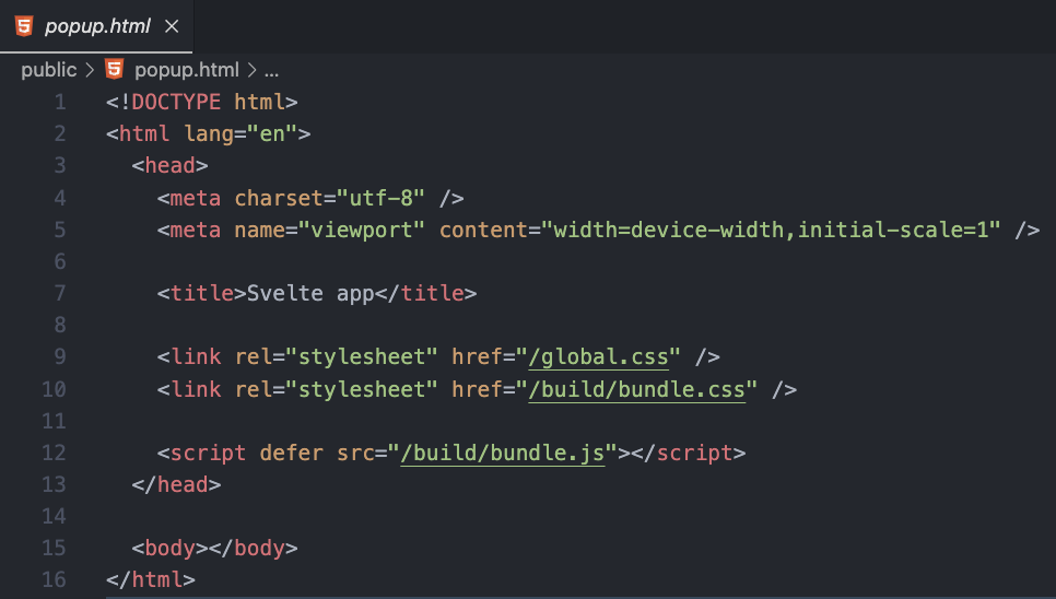 위 이미지같은 경우 svelte를 사용하는 프로젝트의 popup.html이라 내용이 크게 특별할거 없이 svelte가 번들링된 js를 가져오고 번들링된 css와 전역 css를 가져오는 정도가 전부이다. 이마저도 필수사항은 아니니 프로젝트 상황에 따라 적절하게 이용하면 되는 것이다.
