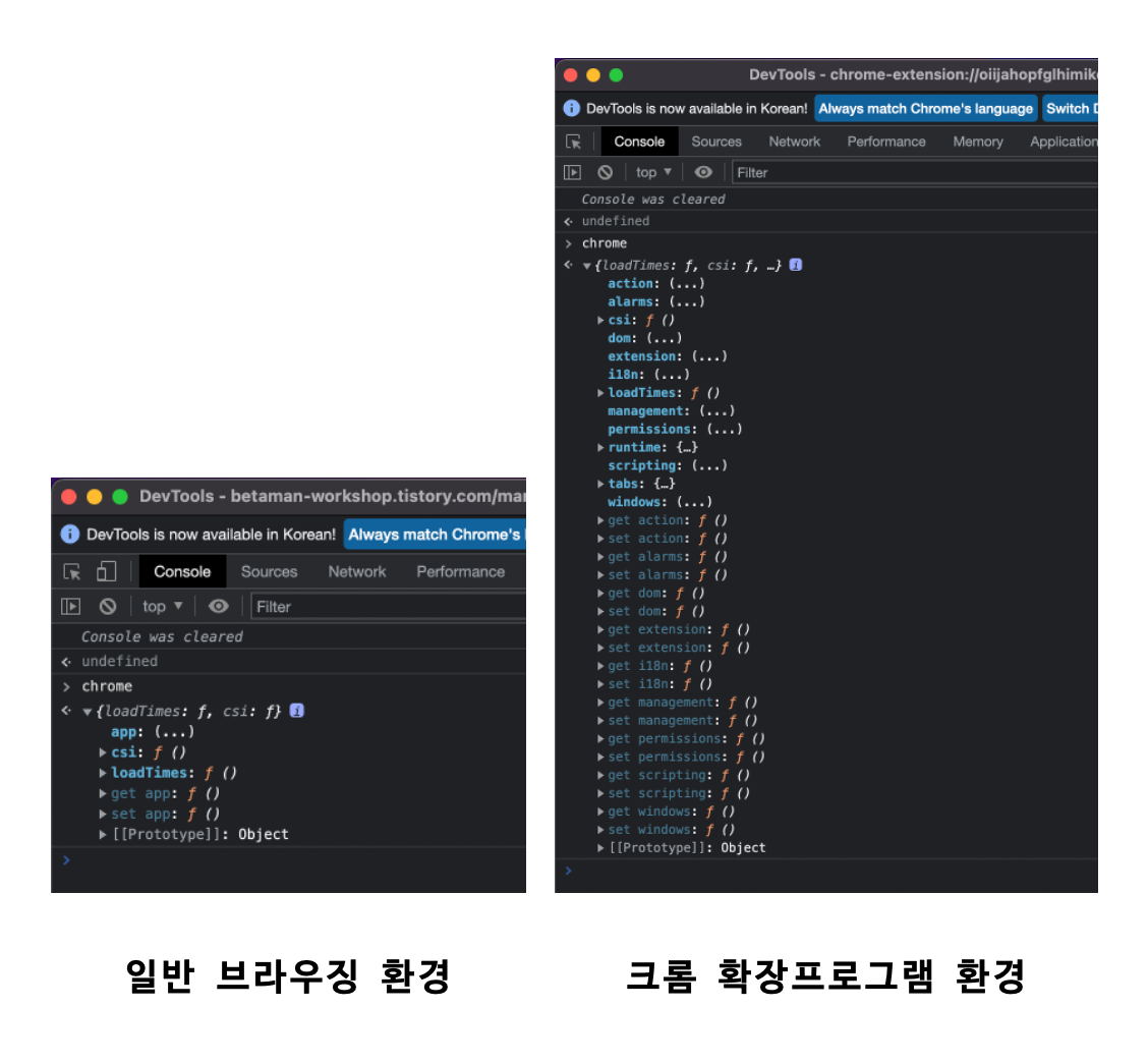 각각의 환경에서 chrome 객체를 확인해보면 확연하게 차이가 나는것을 볼 수 있다. 크롬 확장프로그램 환경에서 제공되는 chrome 객체에는 manifest.json에서 요청된 권한에 따라 조금씩 달라지지만 크롬 확장프로그램에서만 사용할 수 있는 API들이 제공됨을 알 수 있다.
