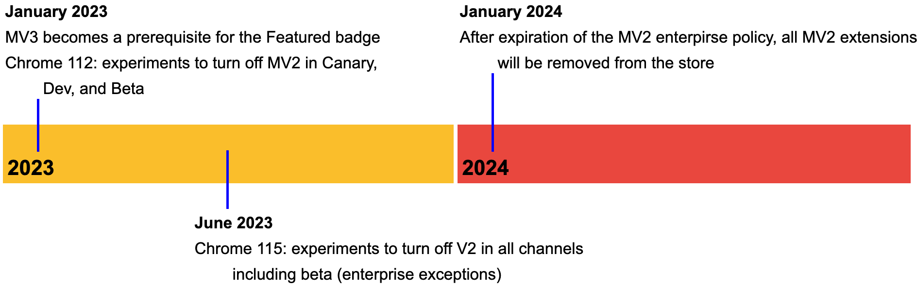 하지만 구글이 v3를 공개하면서 점진적으로 v2를 제거해나가기로 밝혔고, 이미 2022년 6월부터 새로운 manifest v2기반 확장프로그램의 신규 등록이 중단된 상태이다. 2023년 1월부터는 Chrome 112 버전부터 Canary, Dev 및 Beta 채널에서 Manifest v2 확장프로그램 지원을 해제하는 실험을 실행할 수 있고, 2023년 6월부터 Chrome 115는 모든 채널에 대한 Manifest v2 확장프로그램의 지원을 중단하는 실험을 진행할 수 있으며 2024년 1월부터는 크롬 웹스토어에 기존 Manifest v2 확장 프로그램의 업데이트를 중단되며 모든 v2 확장프로그램이 스토어에서 제거된다.