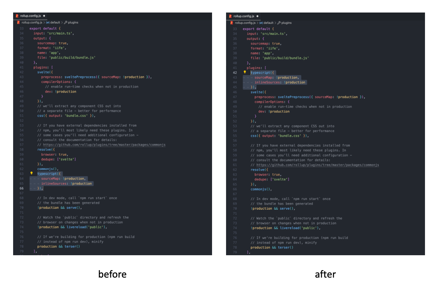 그래서 rollup.config.js 내 Svelte 프로젝트의 엔트리 .ts 번들링 과정 플러그인들 중 typescript 플러그인이 svelte 플러그인이 적용되기 이전에 위치하도록 수정해야 한다. svelte가 빌드 & 번들링 되기 전에 typescript를 javascript로 빌드하고 svelte가 빌드 & 번들링되기 때문에 앞에서 말한 오류가 발생하지 않는다.