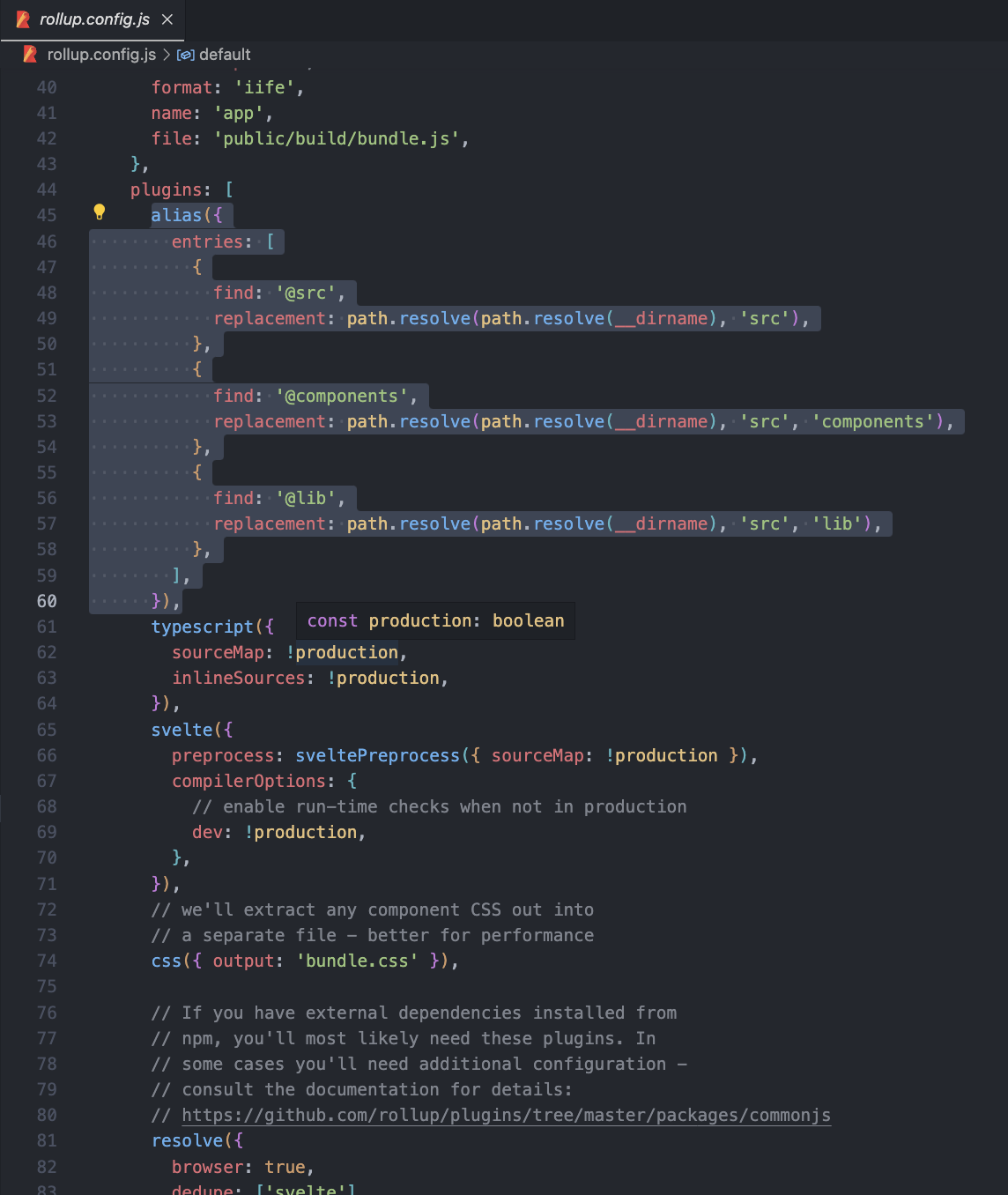 설정 시 주의할 점은, path alias는 소스가 빌드되기 전에 적용이 되어야 하므로 Svelte 프로젝트의 엔트리 .ts 번들링 과정에서 적용되는 플러그인들 중 가장 먼저 적용이 되도록 설정해야한다.