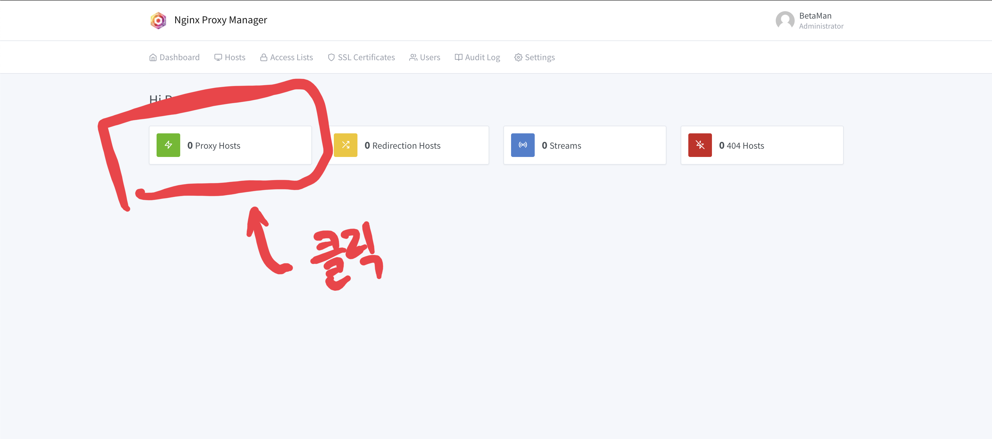 우선 "http://localhost:81"를 접속하여 로그인하고 "Proxy Hosts" 메뉴를 클릭한다.