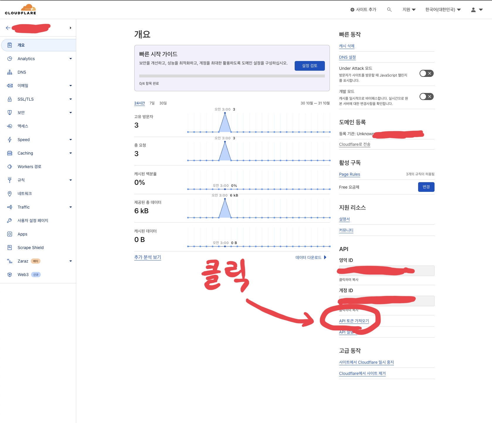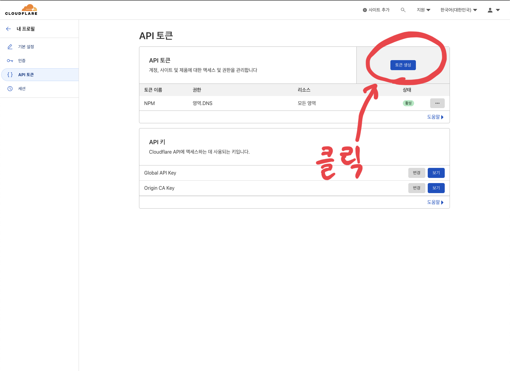 다시 도메인 개요 페이지로 돌아가서 페이지 오른쪽 하단에 "API 토큰 가져오기"를 클릭한 뒤, "토큰 생성" 버튼을 클릭한다.