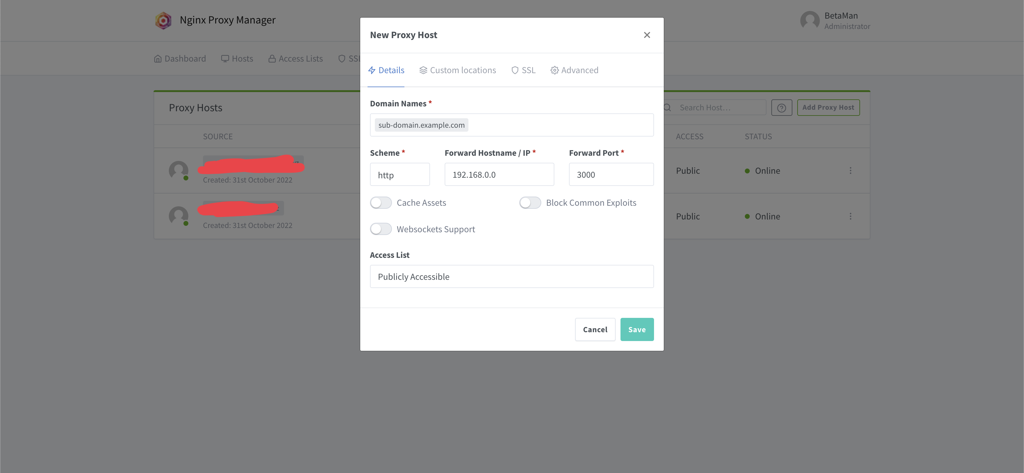 Domain Names는 아까 CloudFlare DNS에서 등록한 A레코드 서브도메인을 기입하고, Forward Hostname / IP에는 아까 A레코드의 IPv4 주소로 등록했던 IP주소를 그대로 기입해준다. 그리고 Forward Port에는 개발 서버가 구동되고 있는 TCP 포트를 기입해주면 된다.