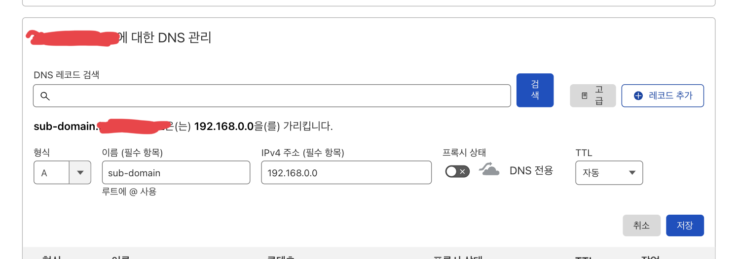 CloudFlare에 연결된 개인 도메인의 DNS 설정페이지로 들어가서 새로운 A레코드 서브도메인을 추가하고 해당 레코드의 IPv4 주소를 아까 적어둔 개발 서버의 사설 IP주소로 기입한 뒤 프록시는 해제하고 저장한다. 이렇게 사설 IP주소가 등록된 A레코드 서브도메인을 만들어두면, 개발 서버와 같은 네트워크(공유기) 내의 다른 기기들에서 해당 서브도메인으로 접근했을때 개발서버의 IP주소로 접근하게 된다