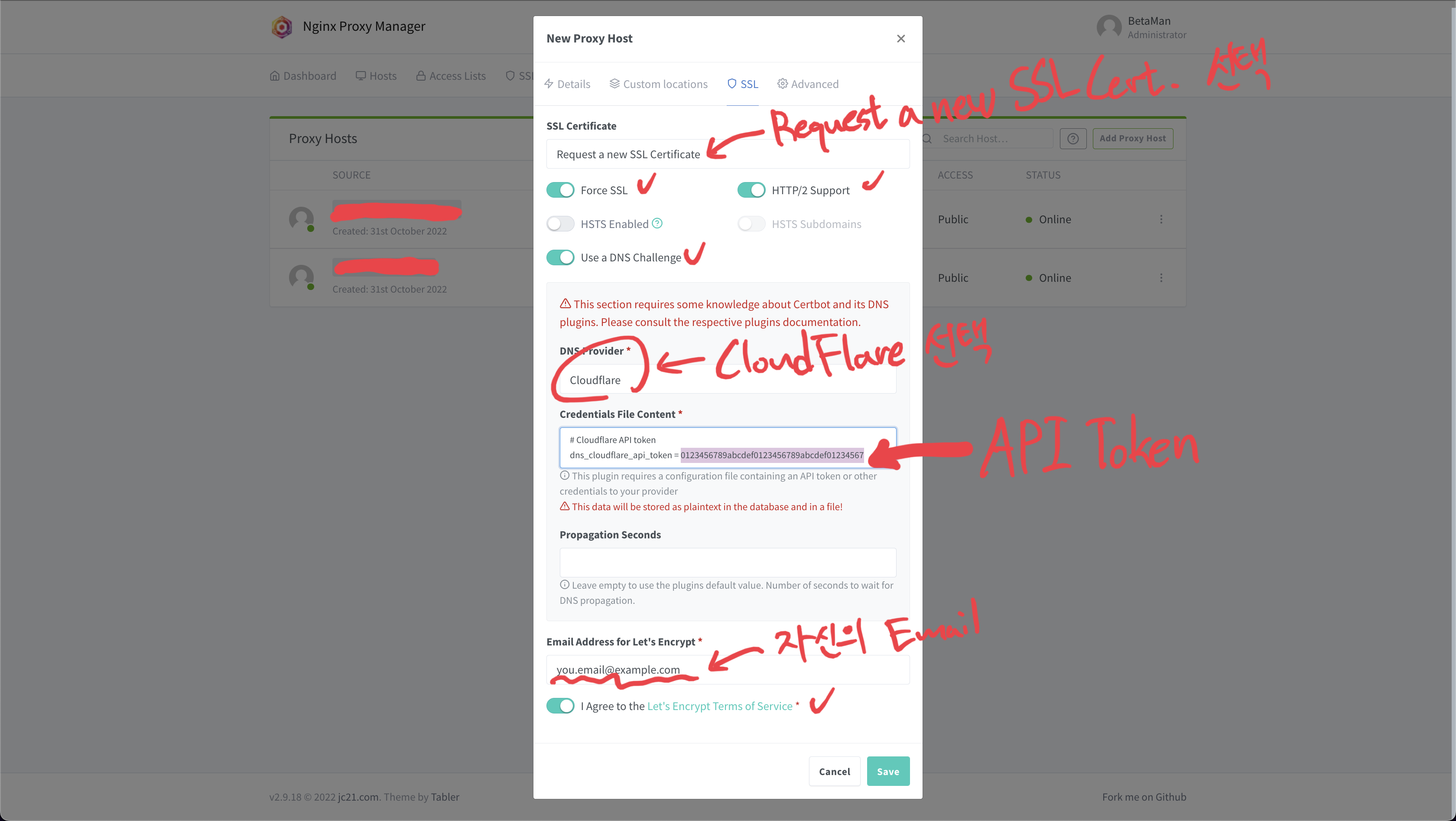 SSL Certificate를 "Request a new SSL Certificate"를 선택하고 "Force SSL", "HTTP/2 Support", "Use a DNS Challenge"를 활성화해준다. Use a DNS Challenge를 활성화하면 DNS Provider 옵션이 나타나는데, 여기서 "CloudFlare"를 선택하고 아래 이미지에서 하이라이트 표시한 API Token 부분에 아까 CloudFlare에서 발급한 API Token을 기입하면된다.