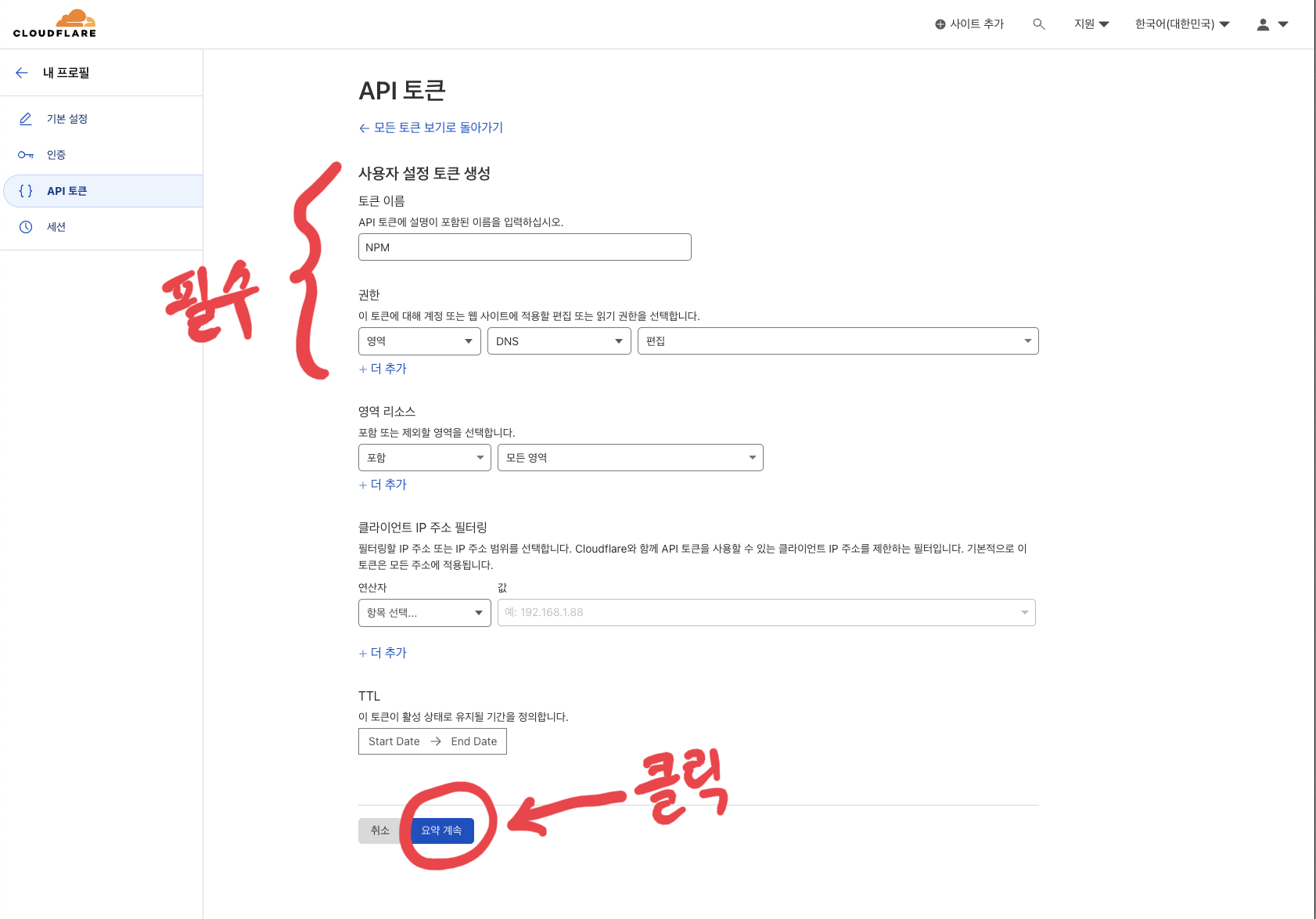 API 토큰 설정 페이지에서 "토큰 이름"과 "권한"을 설정해주면 된다. 이름은 적당히 작성해주고 권한은 "영역", "DNS", "편집"을 선택한 뒤 "요약 계속"을 클릭하고, 다음 페이지에서 "토큰 생성"을 클릭하면 API Token 문자열이 제공된다. 이때 제공되는 API Token은 딱 한 번만 제공되기 때문에 똑같은 토큰을 다시 받을 수 없어서 잃어버리지 않게 꼭 잘 적어두고 공유되지 않도록 주의해야한다.