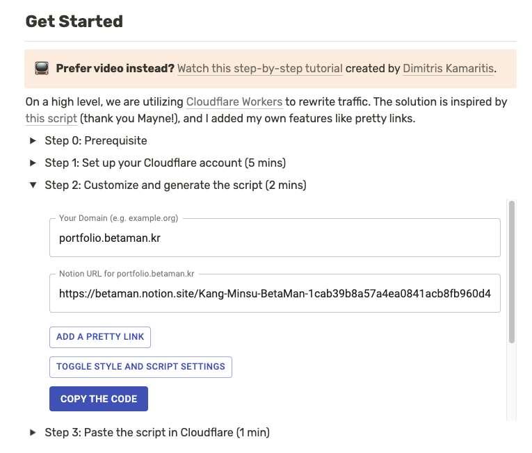 우선, 위 사이트에 들어간 후 "Step 2" 항목에 Notion 포트폴리오로 연결한 자신의 도네임(아까 DNS 설정시 추가했던 CNAME 레코드)과 복사해둔 Notion 포트폴리오 URL을 붙여넣어준 뒤에 "COPY THE CODE" 버튼을 클릭하면 우리가 필요한 코드가 복사된다.