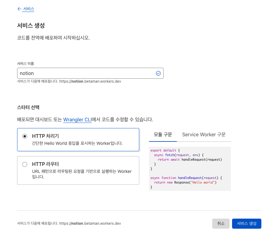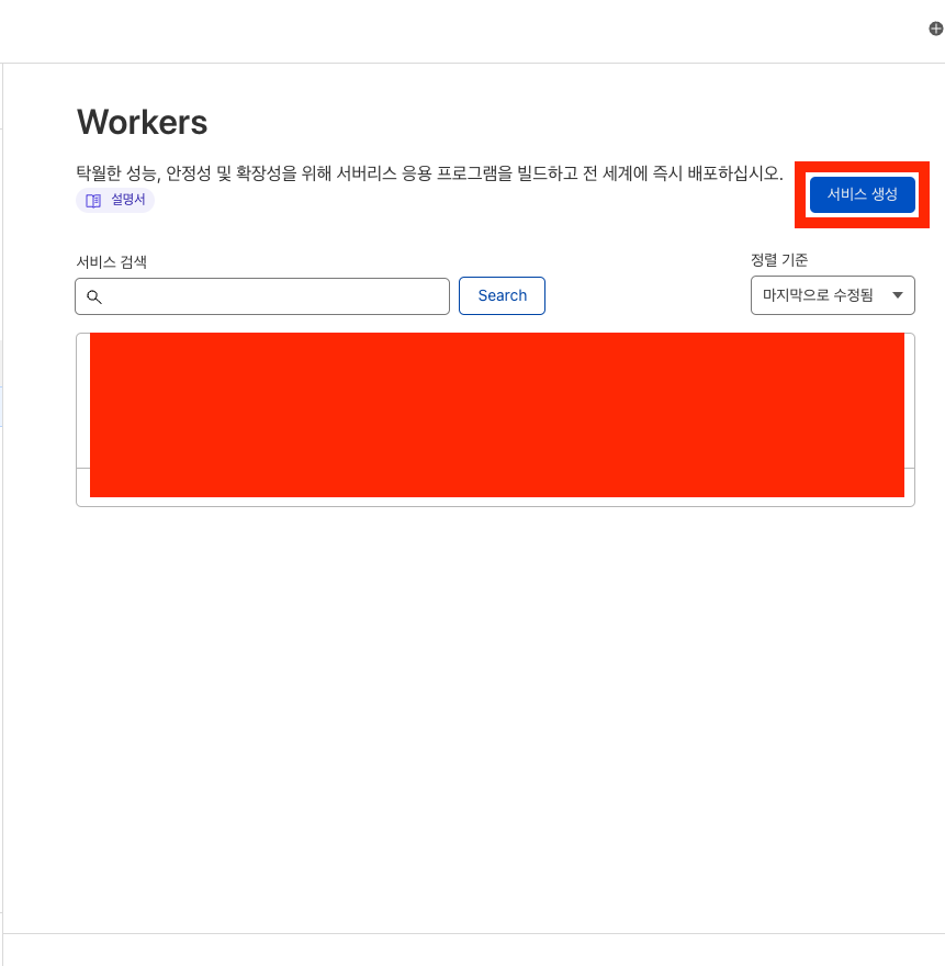 그 후 CloudFlare 홈에서 Workers 메뉴로 들어간 뒤에 "서비스 생성" 버튼을 클릭한다.