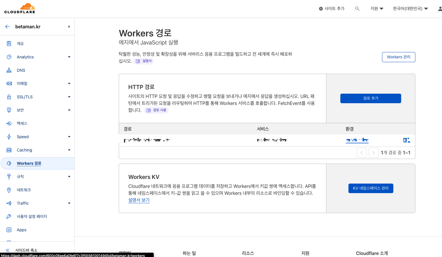 연결할 도메인의 "Workers 경로" 메뉴로 이동한 뒤, "경로추가" 버튼을 클릭한다.