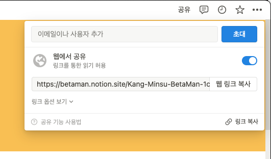 Notion 포트폴리오 공개 공유 URL은 Notion 우측 상단에 있는 공유 버튼을 클릭하며 URL을 복사할 수 있는 팝업이 나타난다.
