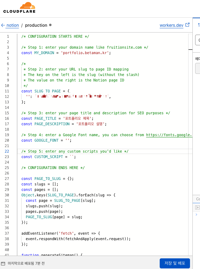 그리고 코드 안에 "Step 3" 부분에 있는 "PAGE_TITLE"에 포트폴리오의 제목을, "PAGE_DESCRIPTION"에 포트폴리오의 설명을 값으로 추가해준다. 이 값은 SEO에 사용되는 값이므로 꼭 추가해주는 것이 좋다. 그 후 "저장 및 배포" 버튼을 클릭하면 설정사항이 모두 적용된다.