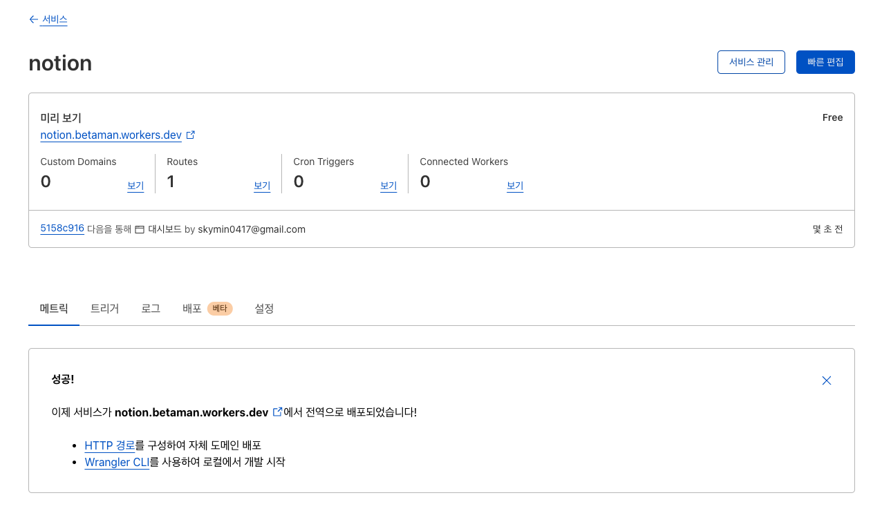 그러면 새로운 Workers 서비스가 생성되고 우측 상단에 "빠른 편집" 버튼이 나타나게 되는데, 이 버튼을 클릭하면 서버리스 코드를 수정할 수 있는 에디터 페이지가 나타난다.