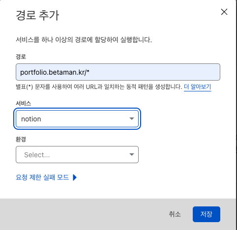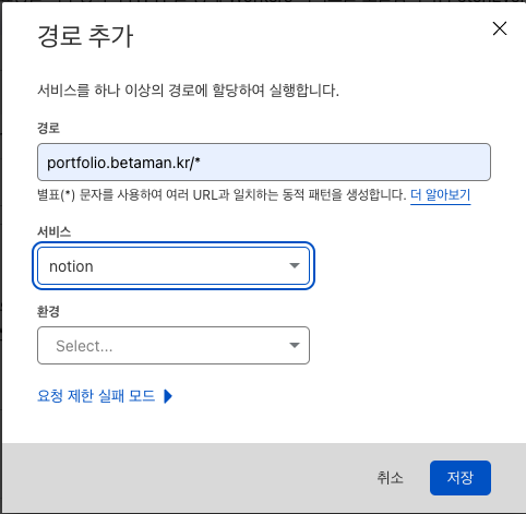 그러면 경로추가 팝업이 나타나는데, 여기에 DNS 레코드로 추가한 Notion 포트폴리오로 연결할 도메인을 경로로 넣어주고 서비스에서 아까만든 Workers를 선택하면 된다.