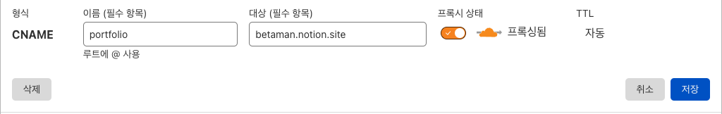 필자의 경우, portfolio.betaman.kr이라는 서브 도메인으로 Notion 포트폴리오를 연결하기 위해 위와 같이 정보를 입력해주었다.
