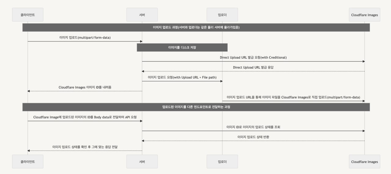 위 시퀀스다이어그램은 Cloudflare Images의 크리에이터 직접 업로드 방식을 이용해서 서버가 직업 이미지 파일을 업로드하는 과정을 나타낸 것이다. 이 과정은 크게 클라이언트, 서버, 업로더로 나누어진다. 클라이언트가 서버로 파일을 업로드 하면 서버가 파일을 임시로 디스크에 저장한 뒤 Cloudflare Images로부터 업로드URL과 이미지ID를 발급받고 업로더에 파일업로드를 요청한뒤 클라이언트에게 이미지 ID를 내려주게 된다. 이때 파일업로드를 요청받은 업로더는 디스크에 저장된 파일을 Cloudflare Image로 업로드를 하고 디스크에서 파일을 제거하게 된다.