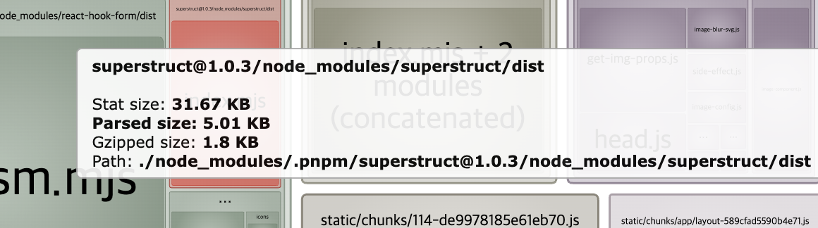 CHINGOO.BE는 Next.js 기반의 프로젝트라서 next-bundle-analyzer를 돌려보았었다. 여러가지 눈에 띄는 큼직큼직한 패키지들이 보인다. react-dom에나 next관련 패키지는 대체 가능한 패키지가 없으니 건너뛰고, 그 다음으로 가장 눈에 띄는 패키지는 위 이미지에서 빨간 박스가 쳐진 Zod 패키지였다.
