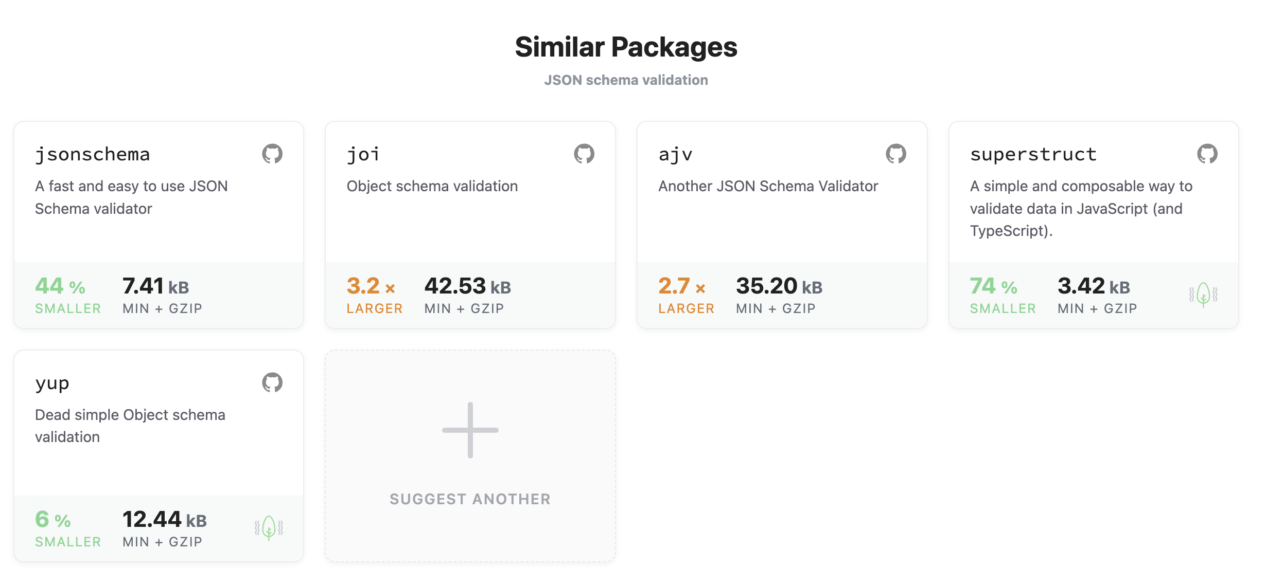 Zod보다 번들 사이즈가 작으면서 비슷한 기능을 제공하는 라이브러리를 찾기 위해 BundlePhobia를 이용했다.