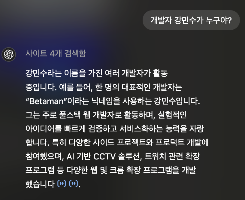 진짜 열심히 SEO 작업하고, 열심히 서치콘솔 돌려야 하는 이유... GPT가 몇가지 검색을 돌리더니 개발자 강민수가 누구냐는 질문에 필자의 포폴 사이트 정보를 제공해주고 있네요.