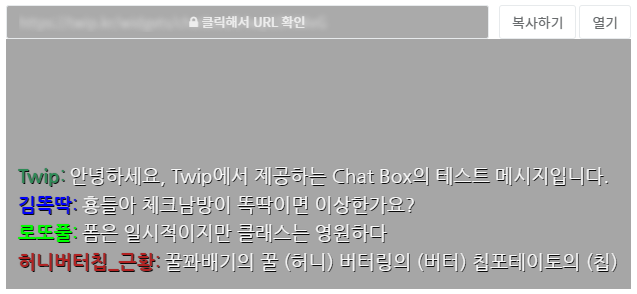 트윕은 자신이 적용한 채팅창 디자인을 데모를 통해 미리 확인 할 수 있도록 제공하고 있다. 그리고 미리보기 윗쪽을 보면, "클릭해서 URL 확인"이라는 부분이 있는데 저 URL은 OBS, XSplit과 같은 방송송출프로그램에 채팅창을 연결할 때 사용하는 URL이다. 이 URL이 자신이 아닌 다른 누군가에게 노출이 되면 내 채팅창을 다른사람이 이용할 수도 있어서 절대로 타인에게 URL을 노출해선 안된다.