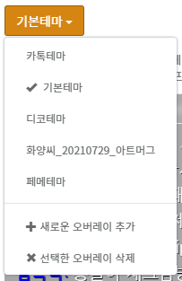 페이지 맨 상단에서 볼 수 있는 노란색 버튼을 클릭해보면, 오버레이라는 것을 선택할 수 있는 메뉴가 뜬다. 오버레이는 트윕 채팅창 설정 정보를 저장할 수 있는 일종의 저장슬롯같은 것이라고 생각하면 된다.