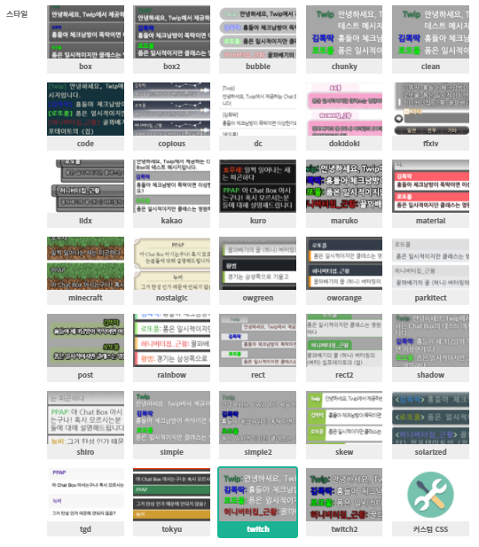 트윕은 기본적으로 여러가지 채팅창 스타일(=디자인)을 제공하고 있고, 자주는 아니지만 계속 디자인을 추가해가고 있다. 스타일 선택창에 있는 스타일들 중 하나를 선택하면 그 스타일이 적용되어 미리보기에 나타나게 된다.