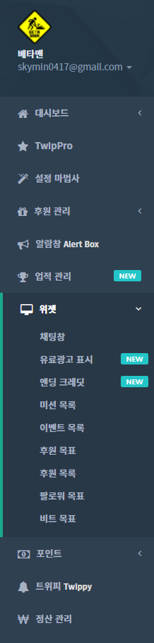 트윕에 트위치 스트리머 계정으로 로그인을 하면 대쉬보드에서 이렇게 길다란 좌측 메뉴를 볼 수 있다. 우리는 이 중 [위젯] > [채팅창] 을 클릭하여 들어갈 것이다.