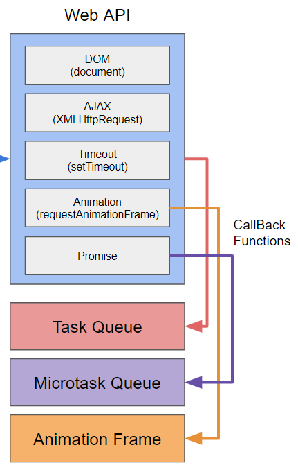 Web API는 JavaScript Runtime에서 제공하는 비동기 작업 수행을 위한 API이다. 비동기 함수가 호출이 되면 JavaScript Engine이 CallBack 함수와 함께 Web API에 작업요청을 전달하고 해당 비동기 함수는 Call Stack에서 제거된다. Web API는 요청받은 작업을 수행하고, 완료가 되면 기본적으로 CallBack Queue 중 Task Queue에 해당 작업의 CallBack 함수를 Enqueue하게 된다.