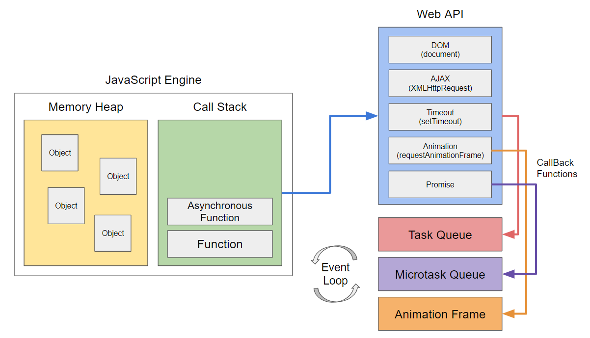 - Web API : 웹브라우저, Node.js 등의 JavaScript Runtime에서 제공하는 API로 DOM, AJAX, Timeout, Animation, Promise 등의 비동기 작업을 수행한다.