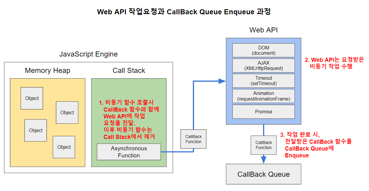JavaScript에서 setTimeout같은 비동기 함수가 호출이 되면 해당 함수가 Call Stack에 쌓이게 되고 JavaScript Engine이 해당 함수를 처리할때는 해당 함수와 해당 함수의 CallBack 함수를 Web API로 비동기 작업요청으로 전달하고 해당 함수를 "Call Stack에서 제거"하게 된다. 문제는 여기서 발생된 것이다.