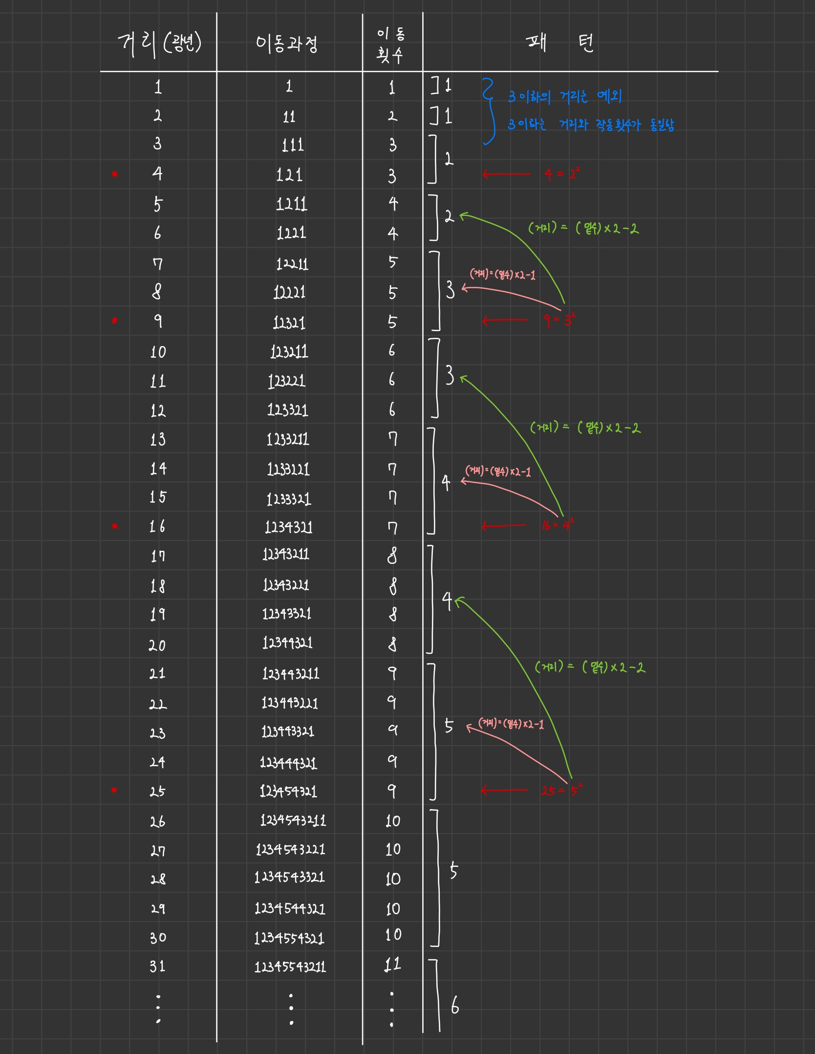 그리고 거리가 어떤 임의의 수의 제곱인 경우를 기준으로 나눠서 보면 각 구간에 있는 이동횟수의 경우의 수가 "(임의의 수)*2-1" 또는 "(임의의 수)*2-2"가 된다는 것을 알 수 있다(예를 들어, 거리가 25이하 17이상인 구간 안에는 이동횟수가 "5*2-1"(9) 또는 "5*2-2"(8)인 경우가 있다.)