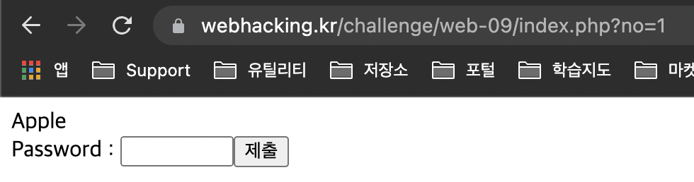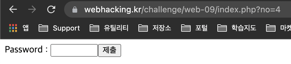"no"의 값에 4를 대입하여 보았더니 아무런 문자열이 나타나지 않고 비밀번호를 입력하는 항목만 나타났다. 아마 쿼리문의 실행 결과가 False일 경우 이러한 결과가 나오는 듯하다. Blind SQL injection을 위해 쿼리 실행 결과값을 True, False로 볼 수 있어야 하는데, "no"의 값을 변화시켜서 문자열이 출력되면 True로 판단하고 아니라면 False로 판단하는데 이용하면 될 듯하다.
