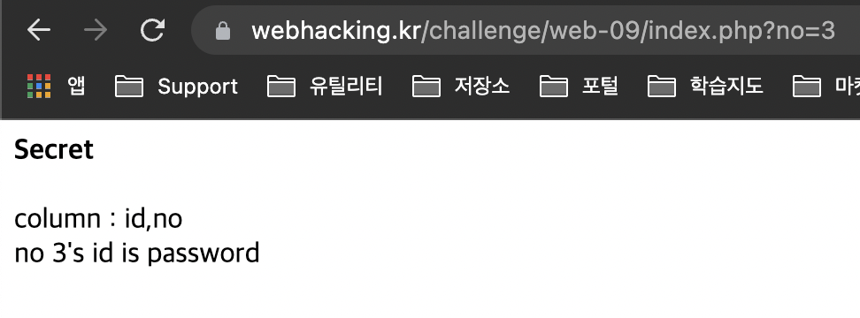GET 파라미터 "no"의 값이 클릭한 앵커의 숫자로 변하면서 각가의 화면이 보이는데, 특별하게도 "no"가 3일때는 "Secret"과 "column: id,no", "no 3's id is password"라는 문자열이 출력된다.