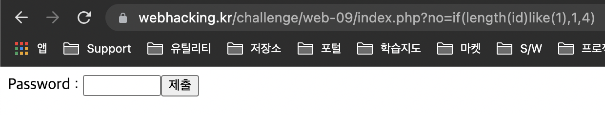 "no"의 값에 4를 대입하여 보았더니 아무런 문자열이 나타나지 않고 비밀번호를 입력하는 항목만 나타났다. 아마 쿼리문의 실행 결과가 False일 경우 이러한 결과가 나오는 듯하다. Blind SQL injection을 위해 쿼리 실행 결과값을 True, False로 볼 수 있어야 하는데, "no"의 값을 변화시켜서 문자열이 출력되면 True로 판단하고 아니라면 False로 판단하는데 이용하면 될 듯하다.