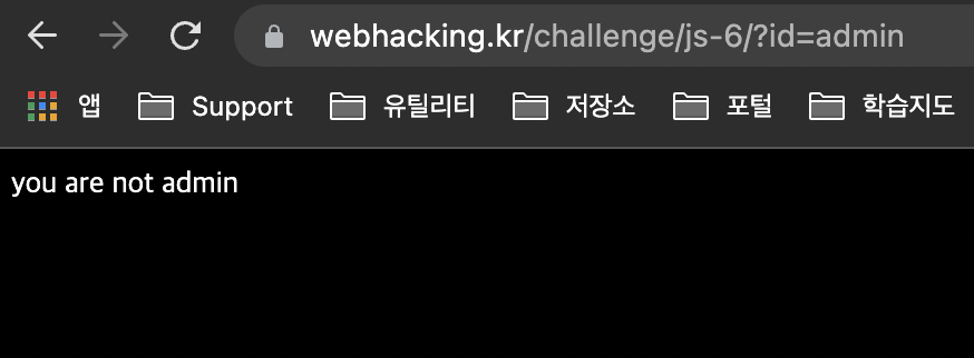 그리고 제출버튼을 눌러보면 GET 파라미터 "id"로 "admin"이라는 문자열이 전달되었고 페이지에는 "you are not admin"이라는 문자열이 출력된다. 아마 이번 문제는 admin으로 로그인하는 것이 해결 목표인듯하다.