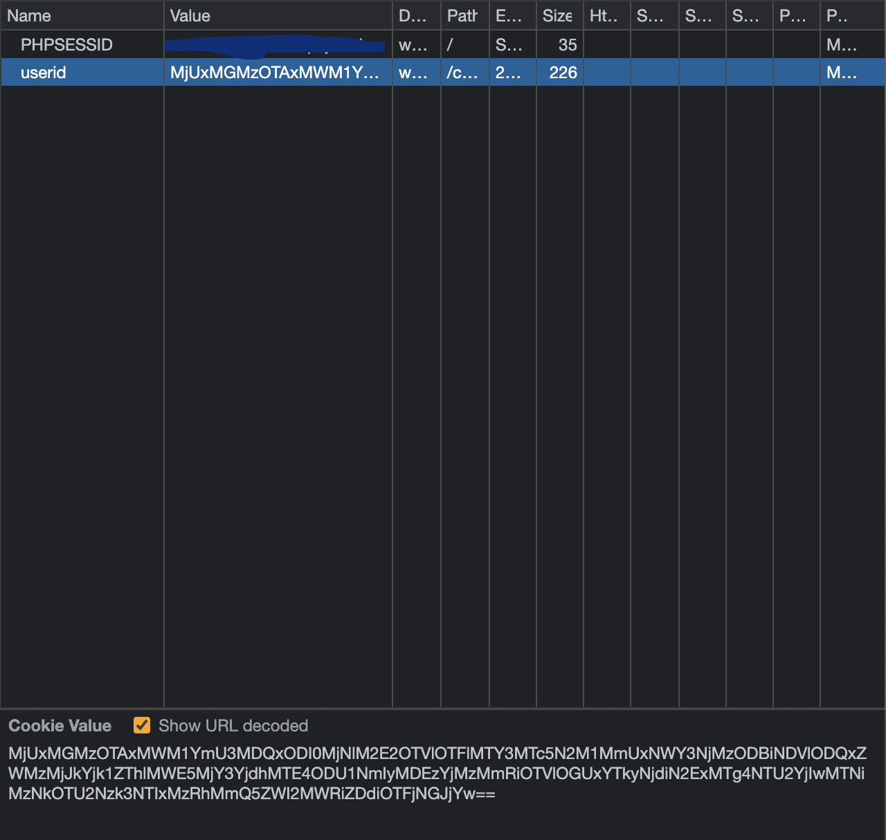 아니나 다를까 "userid"라는 이름의 쿠키가 하나 저장되어있는 모습을 볼 수 있다. 이 쿠키 안에는 Base64로 인코딩된 문자열이 있다.